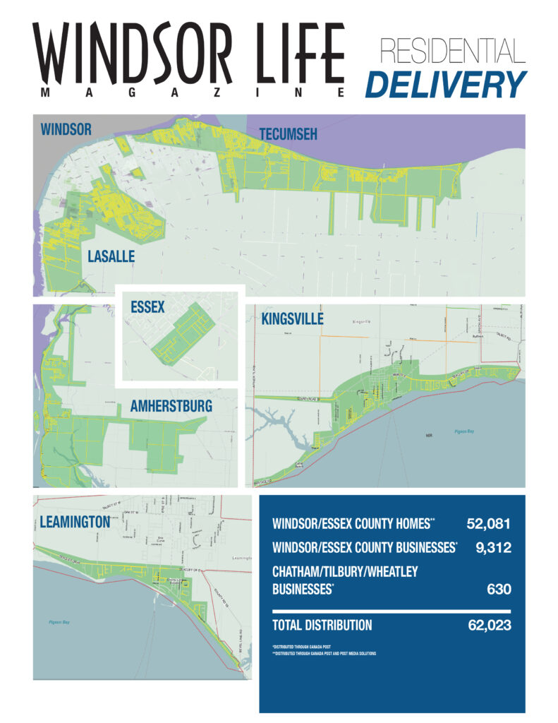 Windsor Life Magazine is direct mailed to every business in Windsor, Essex County and Chatham through Canada Post. The publication is hand delivered to over 50,000 selected homes in Windsor/Essex County through Canada Post and Post Media Solutions. These homes are selected based on their having middle to higher average household income.