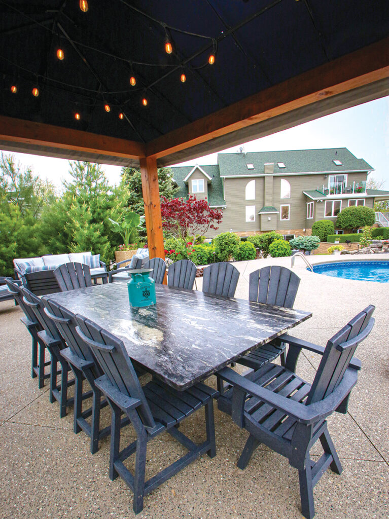 Near the kitchen is an outdoor dining area—featuring a table that can seat up to 10 people. And the table itself is something of a wonder. The metal frame was designed by the owners themselves and is drilled into the concrete—meaning that none of the guests are ever in danger of hitting their legs when moving. As well, the granite for the outdoor dining room table was supplied by Dimanti Stone Countertops & Backsplash.