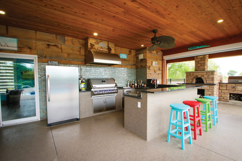 The whole area is a spectacle of Arriscraft Citadel desert brown stone—which, along with the pizza oven, were provided by Santerra Stonecraft. The kitchen also comes equipped with a shimmering countertop and four seats.