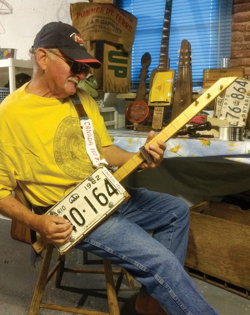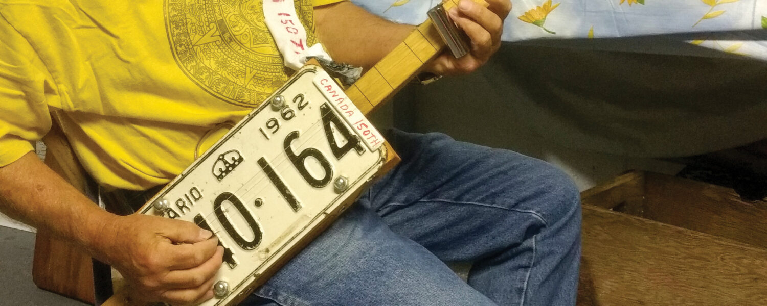 Among the first projects Noel undertook, he commemorated Canada’s 150th birthday, in 2017, by constructing a box guitar using a 1962 Ontario license plate for its face, which fronted a small body comprised of a wooden box. Noel hand-whittled the instrument’s tuning pegs and used bolts for its nut and bridge. The tools he used were few, but included a hand-crank drill to make holes, and a steak knife to carve out slots in the headstock.
